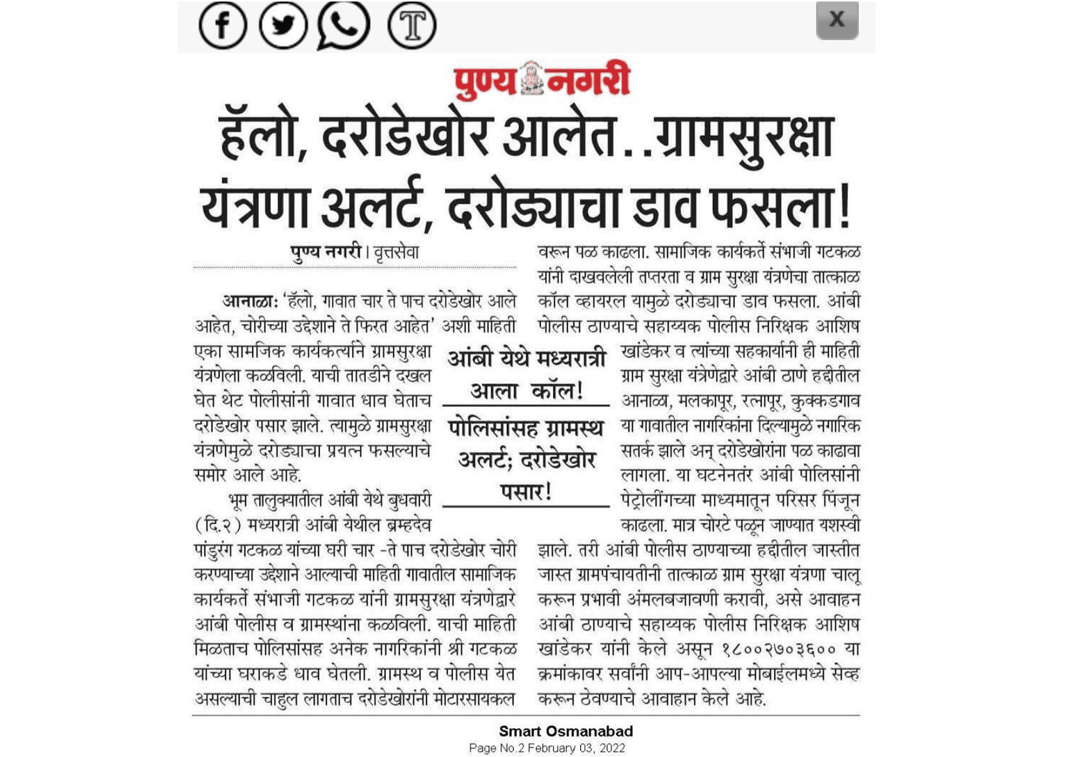 5 दिनांक 09/02/2022 रोजी खामसवाडी ता. कळंब येथे चोरीची घटना टाळण्यात यश.