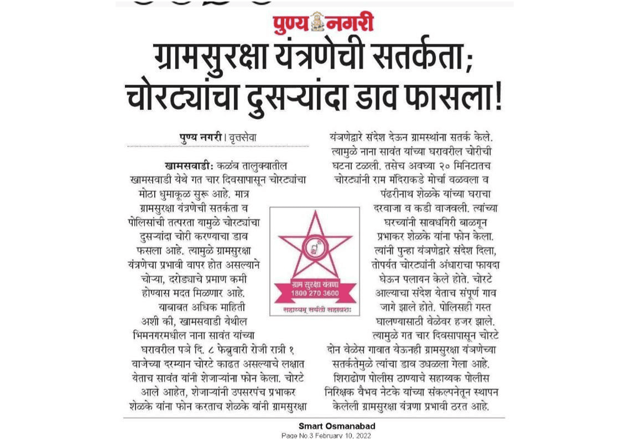 10. दिनांक 19/02/2022 रोजी खामसवाडी ता. कळंब येथे चोरीची घटना टाळण्यात यश.