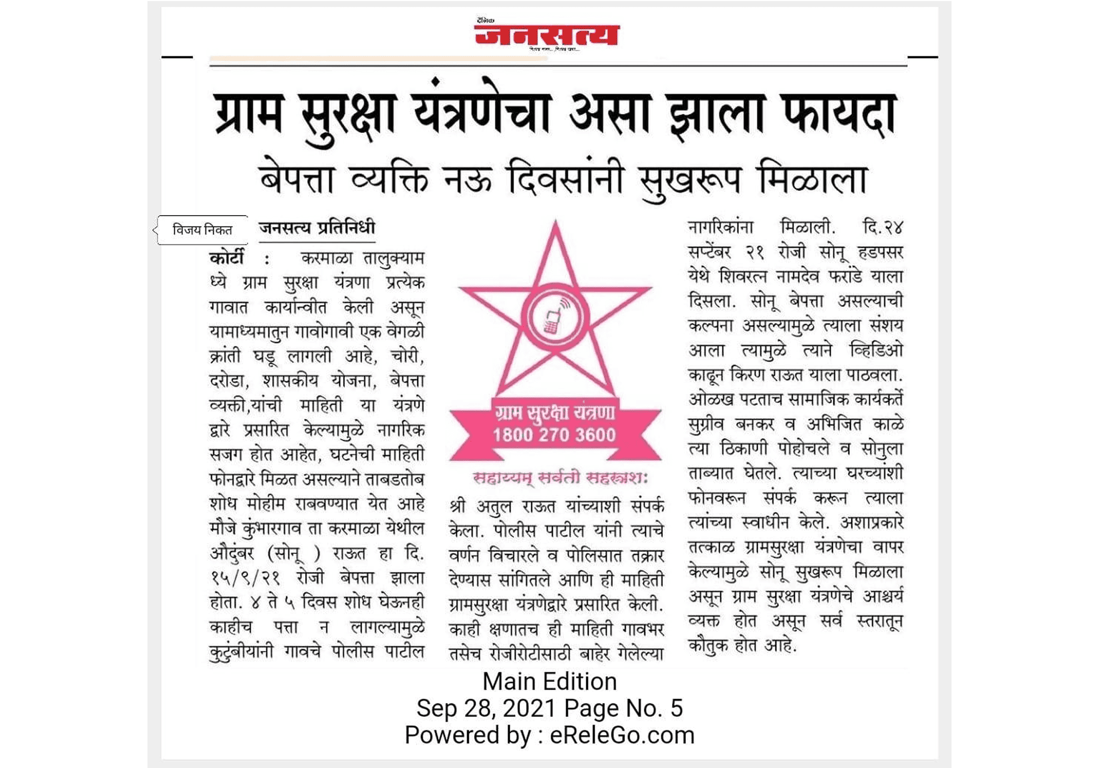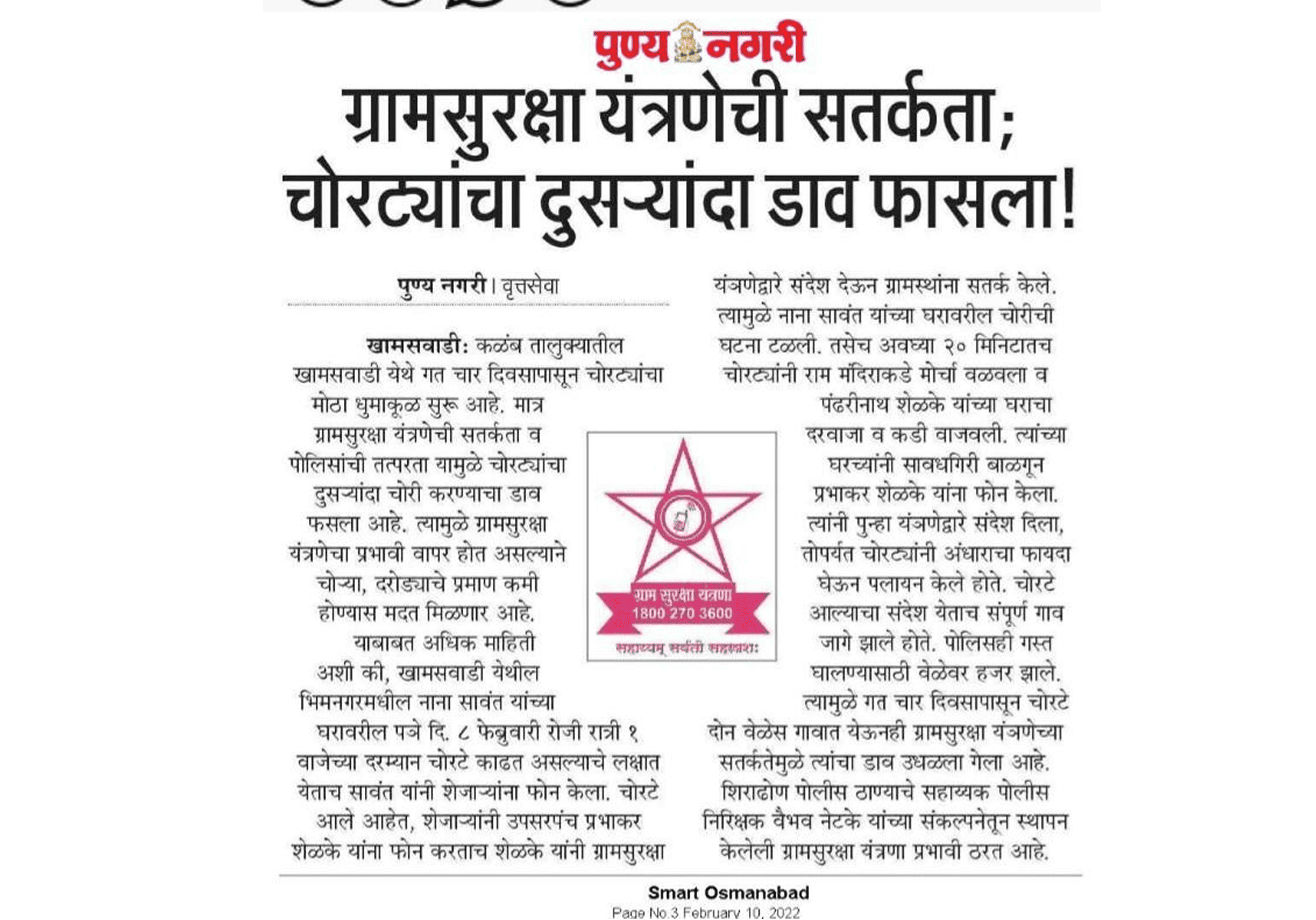 - ग्राम सुरक्षा यंत्रणेचा जिल्ह्यात आजवर झालेला वापर = 12841 वेळा