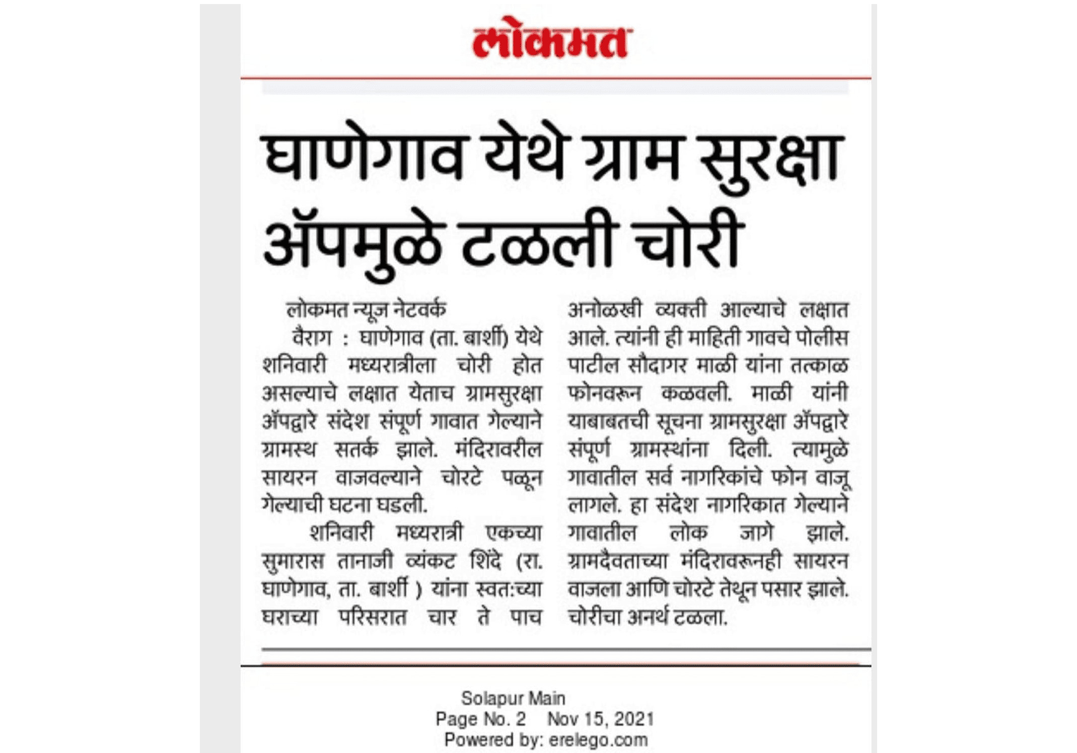- 24/09/21 रोजी पांगरी पोलीस स्टेशन हद्दीतील चोरीची घटना टाळण्यात यश.