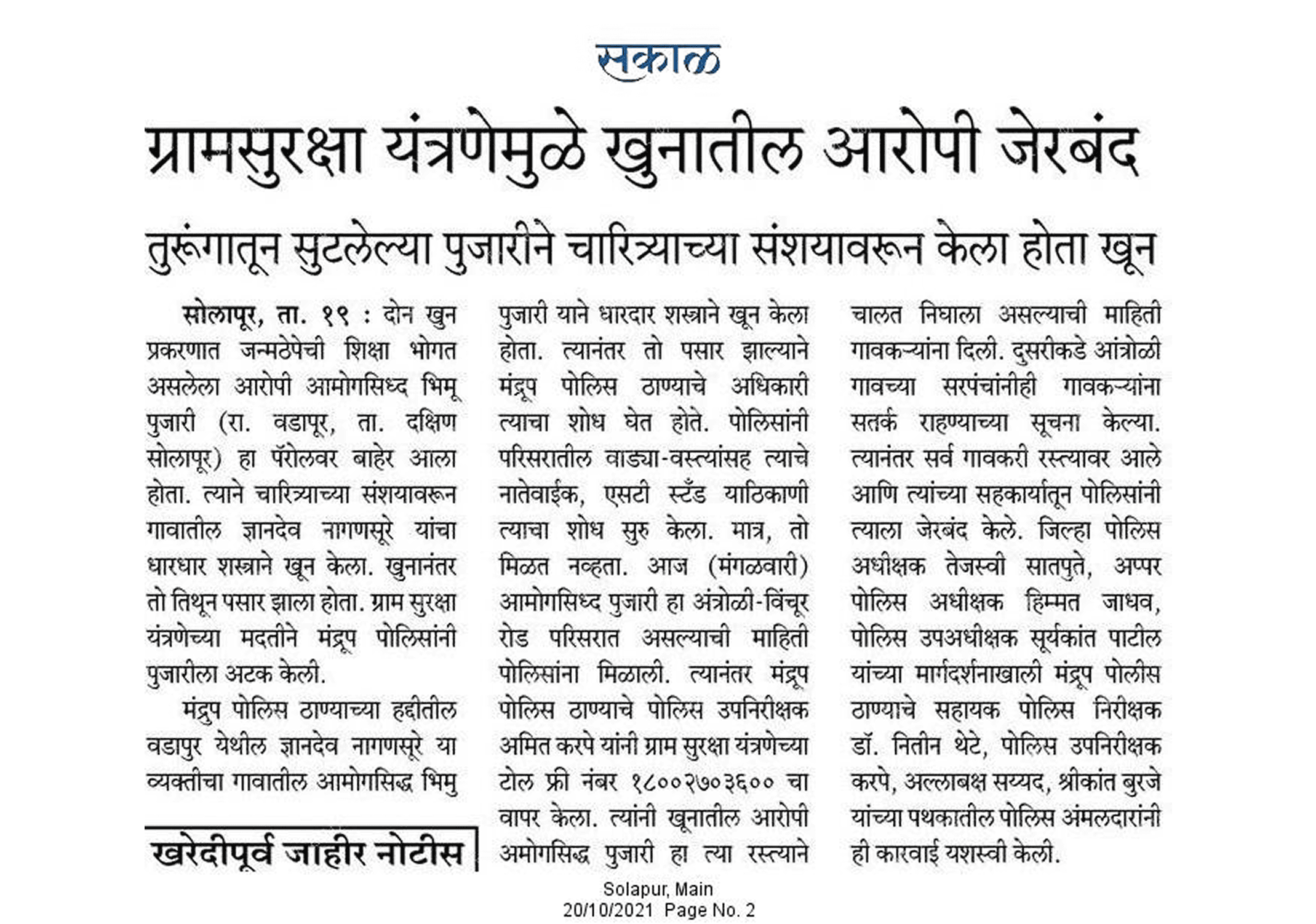 - 19/10/21 रोजी मंद्रूप पोलीस स्टेशन हद्दीतील खुनाच्या गुन्ह्यातील आरोपी जेरबंद करण्यात यश.