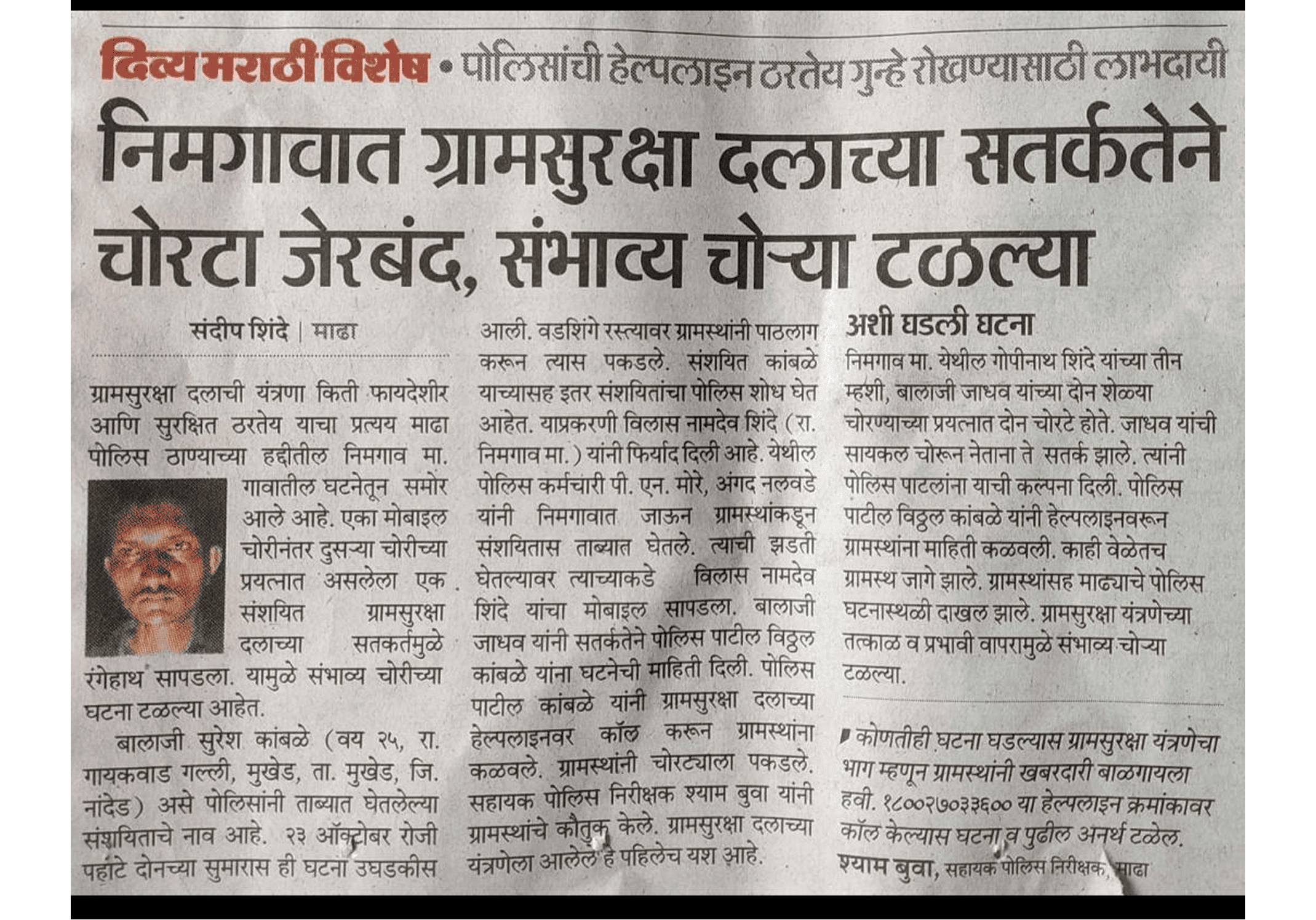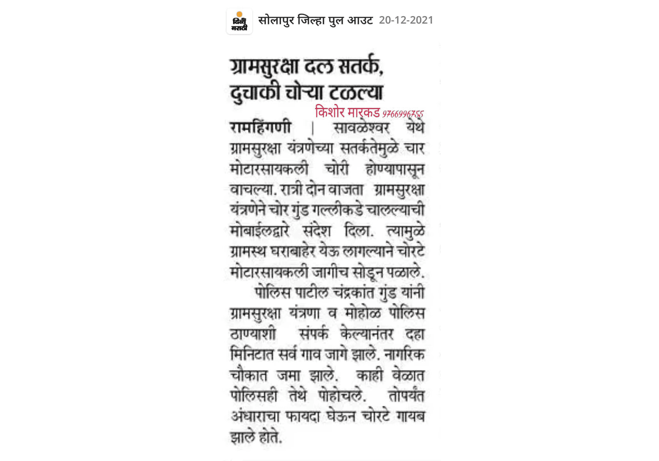 - 12/10/21 रोजी करमाळा पोलीस स्टेशन हद्दीतील भिलारवाडी येथे चोरीची घटना टाळण्यात यश.