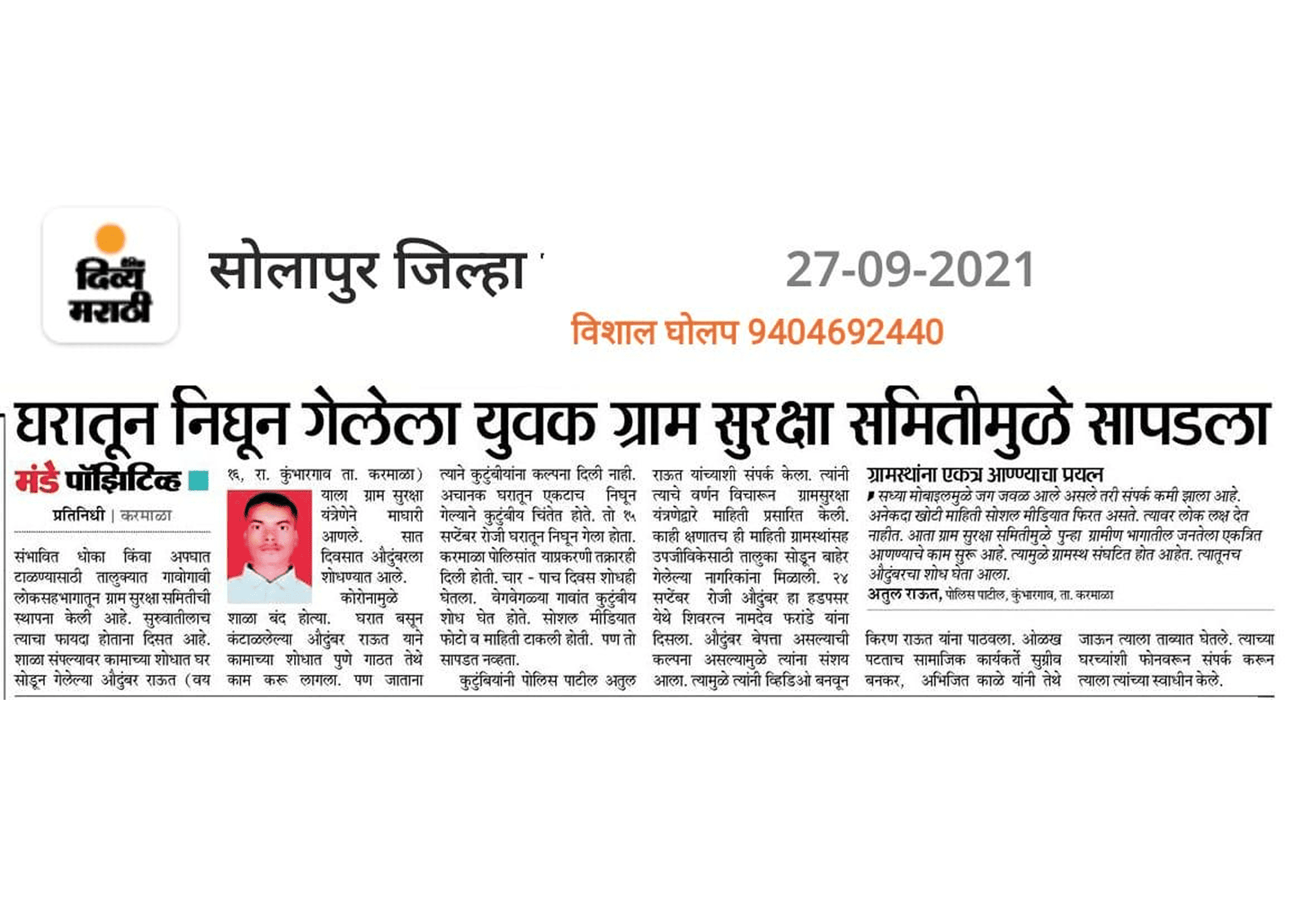 - 19/09/21 रोजी करमाळा पोलीस स्टेशन हद्दीतील उमरड गावातील चोरीची घटना टाळण्यात यश.