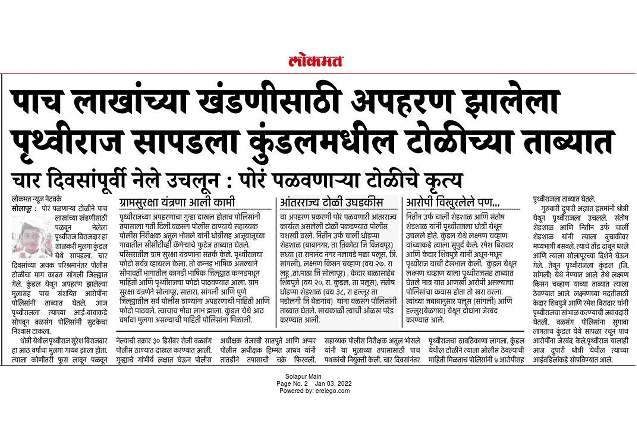 - 19/03/22 अक्कलकोट उत्तर पोलीस स्टेशन हद्दीतून अपहरण झालेल्या 2 मुली 1 तासात शोधण्यात यश.