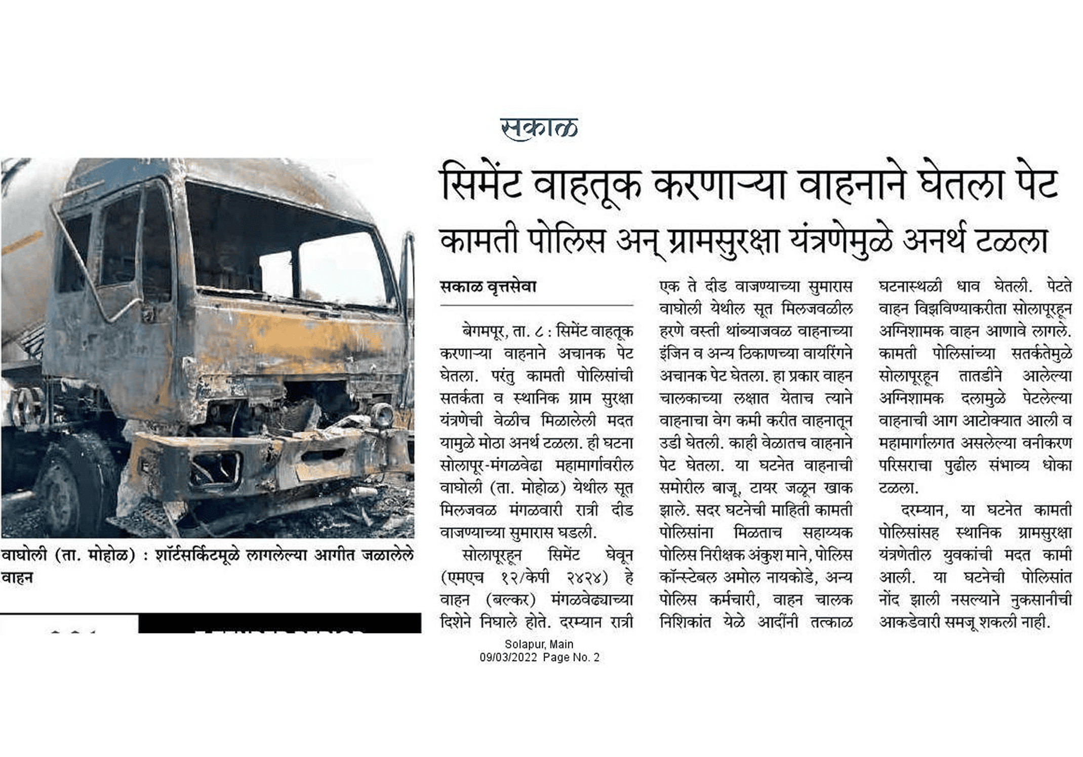 - 16/04/22 रोजी करमाळा पोलीस स्टेशन हद्दीतील भिलारवाडी येथे 20 एकर ऊस आगीपासून वाचवण्यात यश.