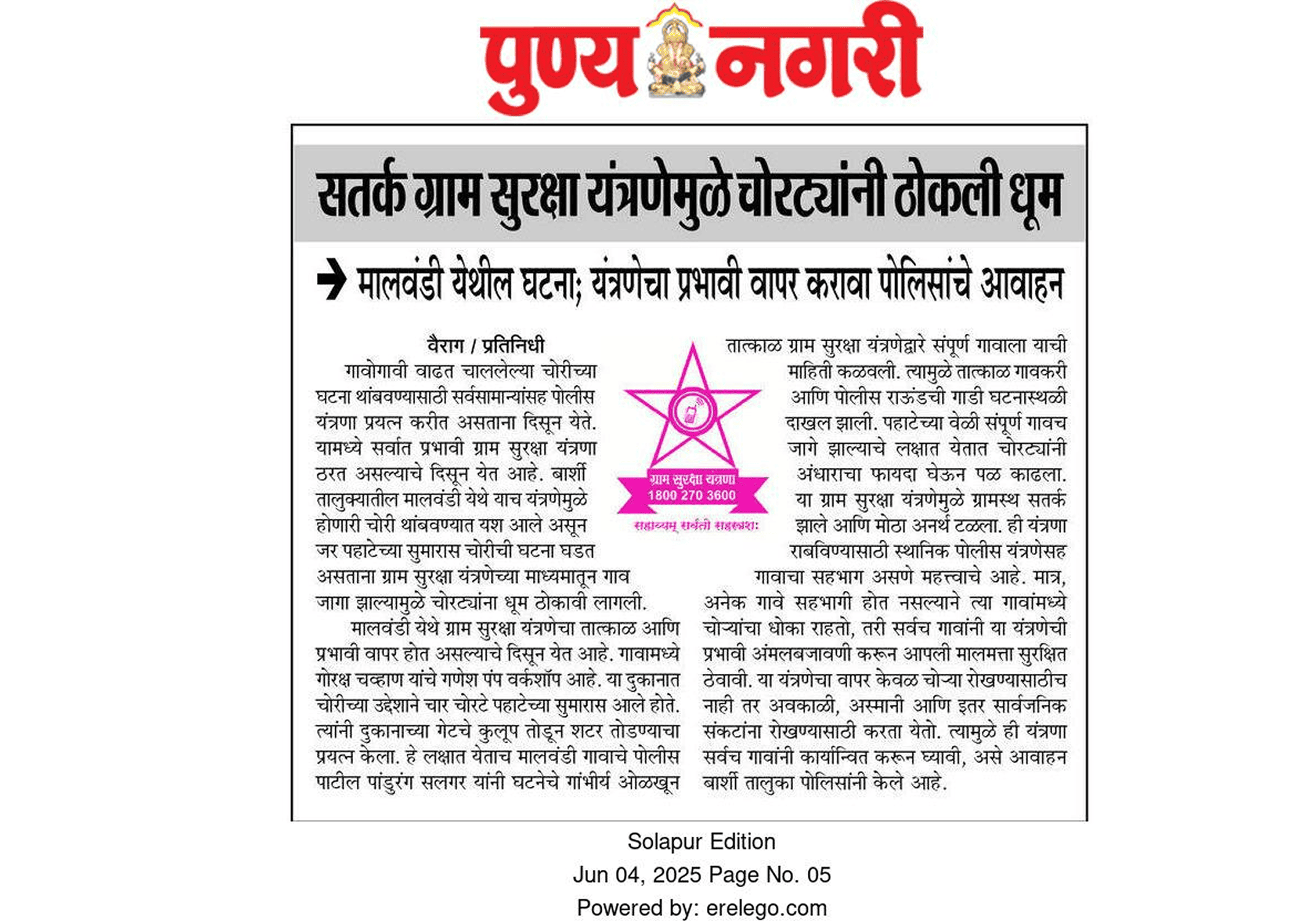 - 10/06/23 रोजी पंढरपूर तालुका पोलीस स्टेशन हद्दीतील ईश्वर वाठार येथे चोरीची घटना टाळण्यात यश