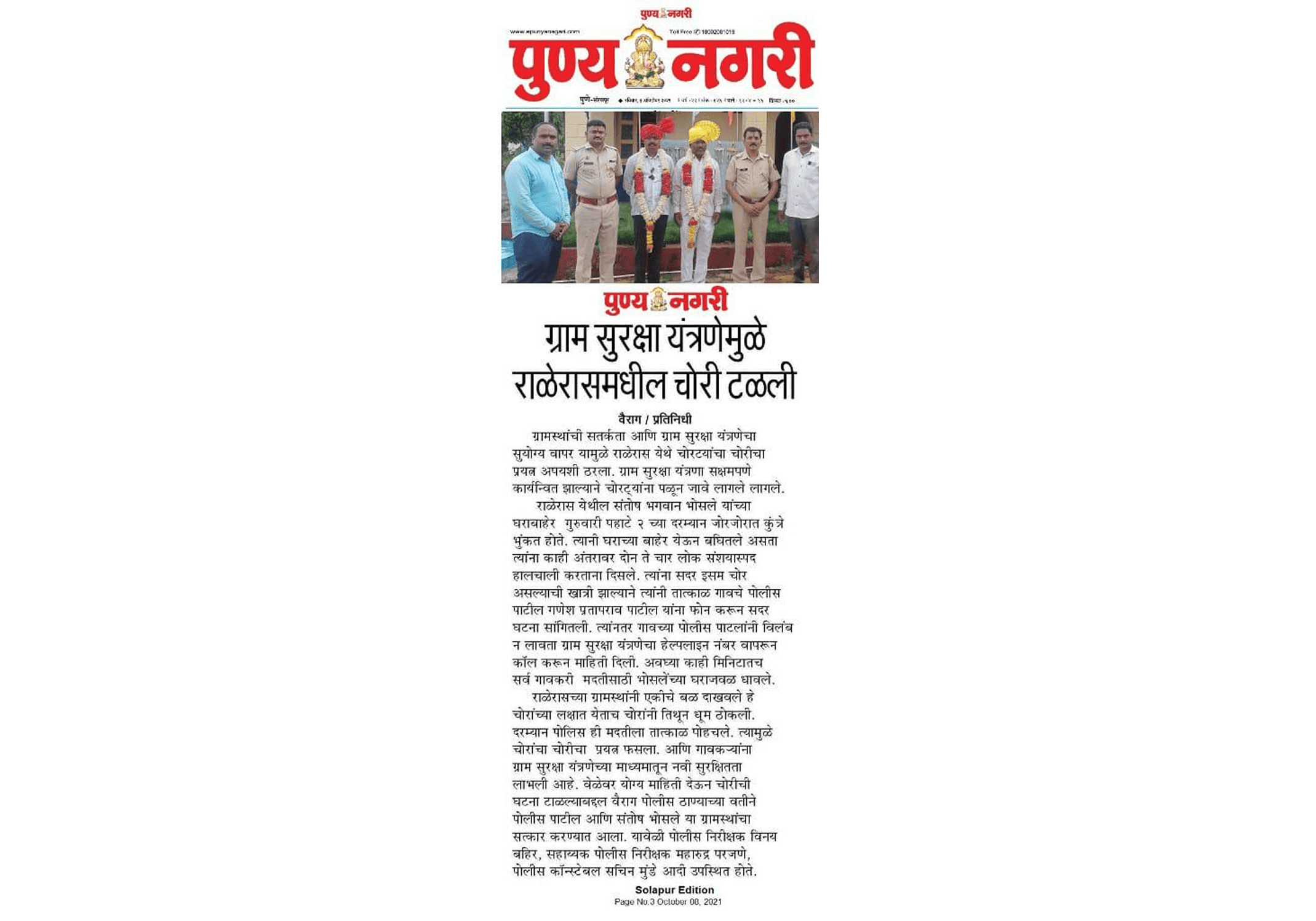 - 07/10/21 रोजी वैराग पोलीस स्टेशन हद्दीतील राळेसर येथे चोरीची घटना टाळण्यात यश.