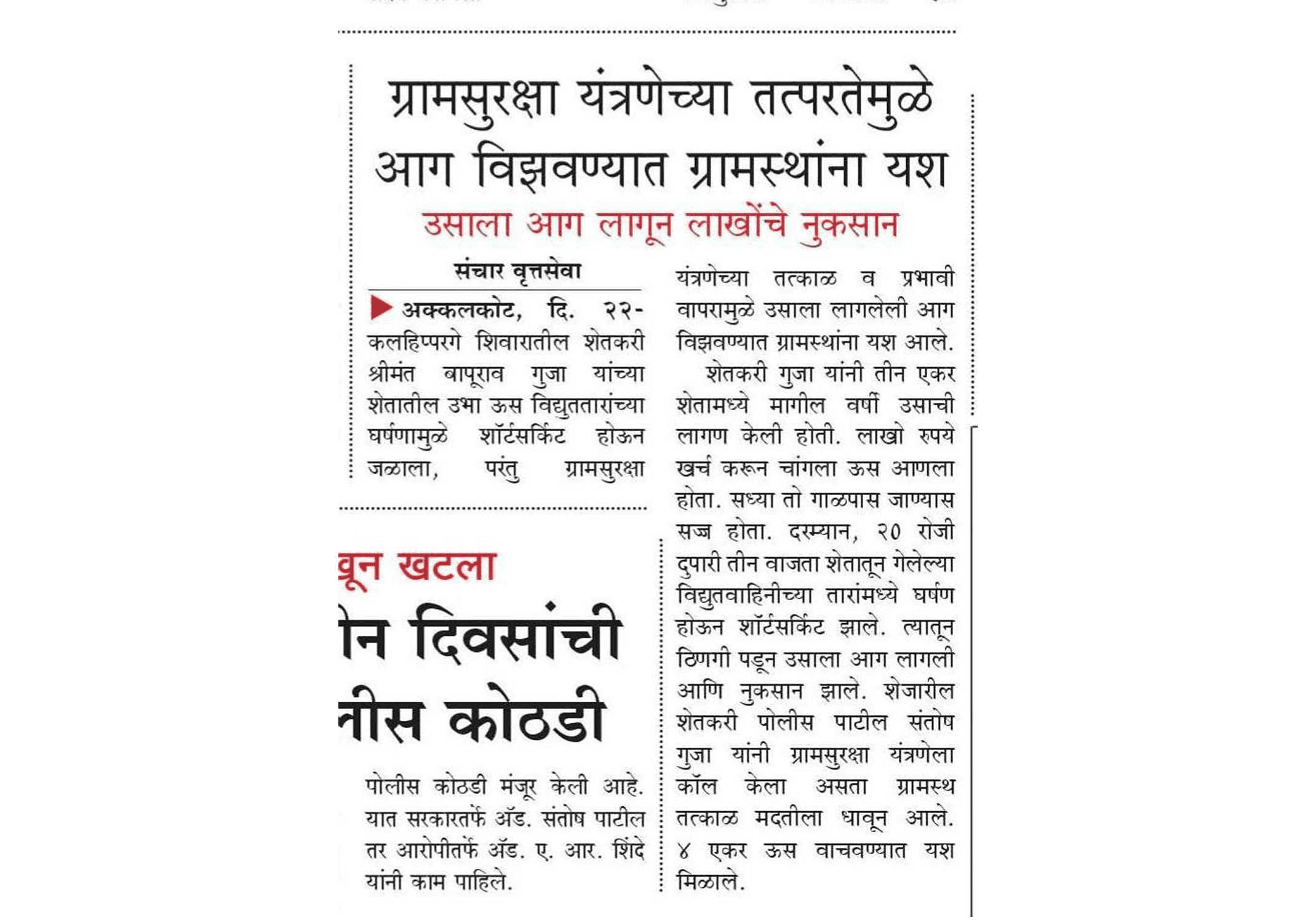 - 27/01/23 रोजी माढा पोलीस स्टेशन हद्दीतील तांदुळवाडी येथे 100 एकर ऊस आगीपासून वाचवण्यात यश.