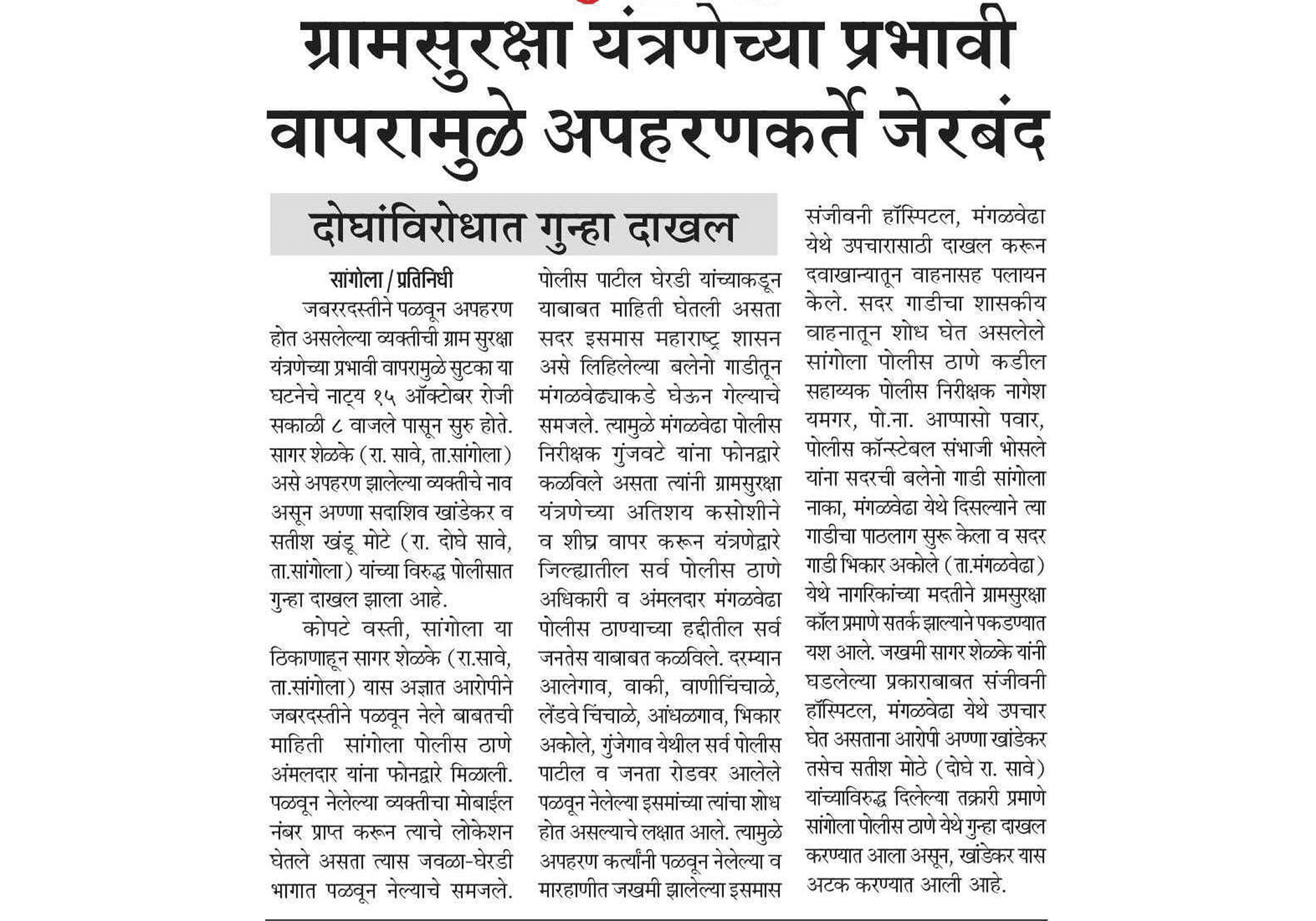 - 15/10/21 रोजी मंगळवेढा पोलीस स्टेशन हद्दीतील घटनेत अपहरणकर्ते जेरबंद करण्यात यश.